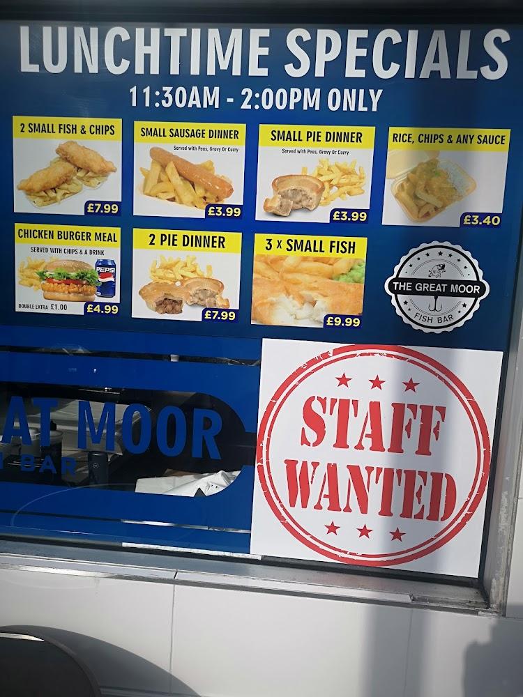The Great Moor Fish Bar sits in the heart of Stockport, an area that thrives on its local food culture. The spot is easily recognizable along Buxton Road and provides convenient outdoor seating, takeaway options, and dine-in services for those who wish to enjoy their meal on-site. Parking is free on the street, which is a real bonus for those visiting during busy hours.